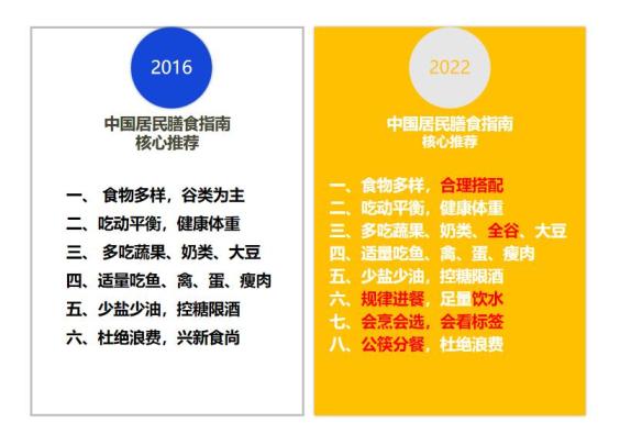 最新的《中国居民膳食指南(2022)》发布,与上一版的指南相比,也有了一些变化,包括核心8条提示、增加了新的建议,大家可以看下图:
