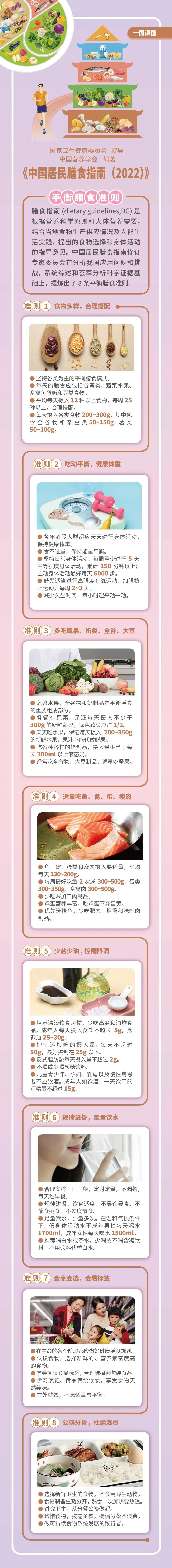 《中国居民膳食指南(2022)》提炼出了平衡膳食八准则:一、食物多样,合理搭配;二、吃动平衡,健康体重;三、多吃蔬果、奶类、全谷、大豆;四、适量吃鱼、禽、蛋、瘦肉;五、少盐少油,控糖限酒;六、规律进餐,足量饮水;七、会烹会选,会看标签;八、公筷分餐,杜绝浪费。