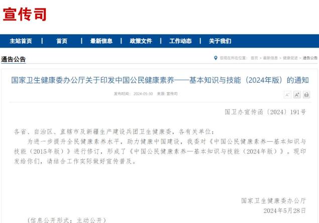 5月30日,国家卫生健康委官方网站正式发布了《中国公民健康素养——基本知识与技能(2024年版)》(简称“健康素养66条”)。